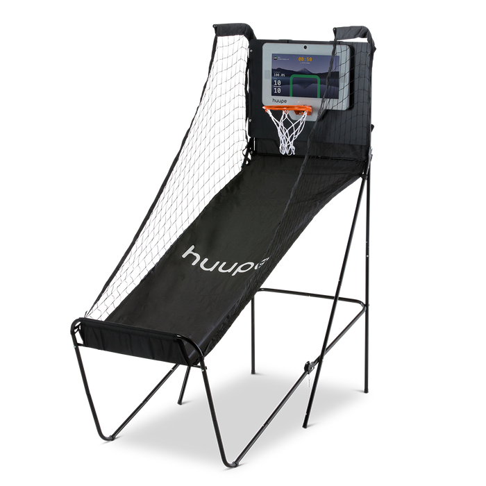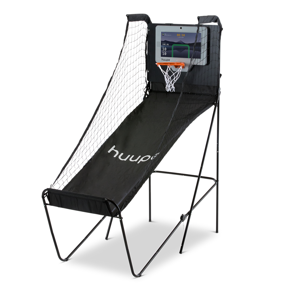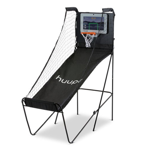 The huupe arcade comes with the huupe mini and the full huupe arcade, both custom designed to make the most advanced smart basketball arcade system in the world. This is the first home arcade system that tracks your makes, your misses, your total attempts AND from what distance each shot was taken, all while the ball rolls back to you for a whole new gaming experience. Oh, and the backboard is a full smart TV that let's you stream your favorite live sports and shows while you play.